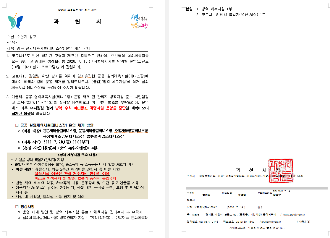 시 방침에 따른 코트 예약 재개 안내(필독)